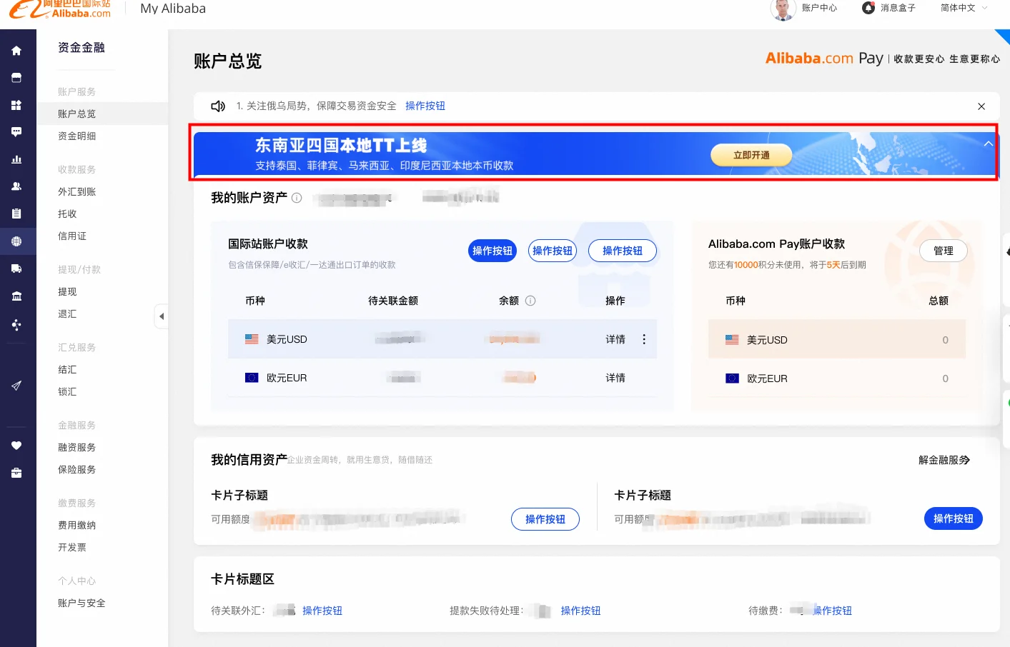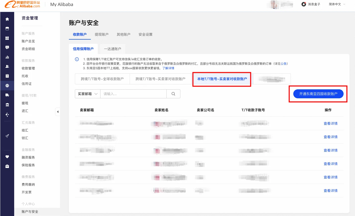 步骤1:开通东南亚四国本地收款账户:产品上线前已入驻国际站的客户,可在资金总览界面点击并立即开通东南亚四国本地收款,或在资金管理-账户与安全-收款账户-信用保障账户-本地T/T账户界面开通东南亚四国收款账户。