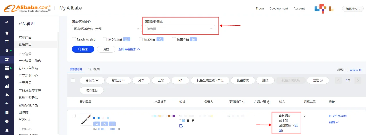 查看路径:“商家后台--产品管理--管理产品”。如商品被国别管控,则商品状态显示为“国别管控中”。商家也可以通过“高级搜索--国别管控国家”进行检索。