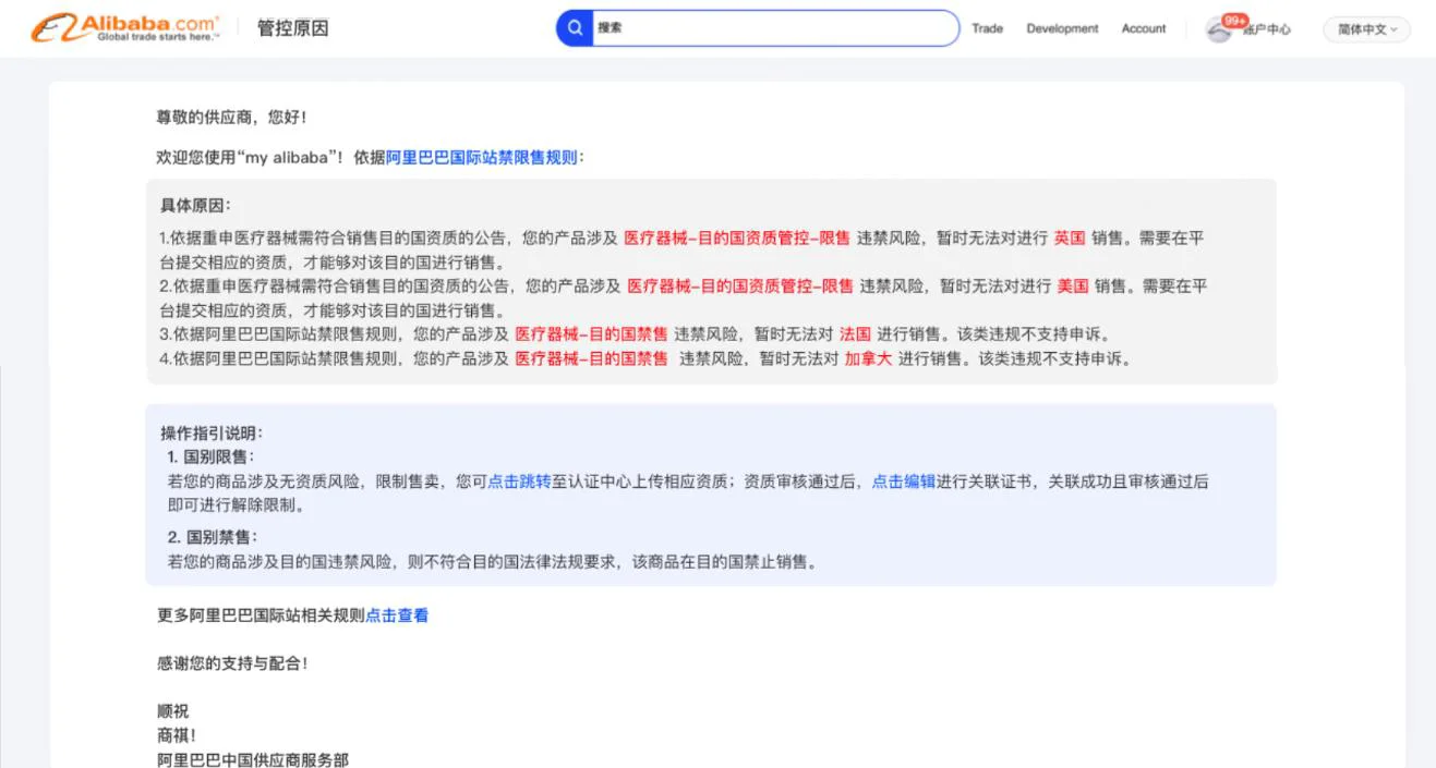 根据《重申医疗器械需符合销售目的国资质的公告》《关于医疗器械商品目的国资质审查系统升级的公告》,阿里巴巴国际站拟对美国市场展示及销售医疗器械的商家应在“认证中心/金品中心--认证检测--国别限售准入”路径下上传、更新FDA资质,并将医疗器械商品关联此资质。平台会对未取得目的市场相关产品资质(含未通过平台资质审核)的医疗器械产品采取限制对目的国市场展示及销售等处罚措施。